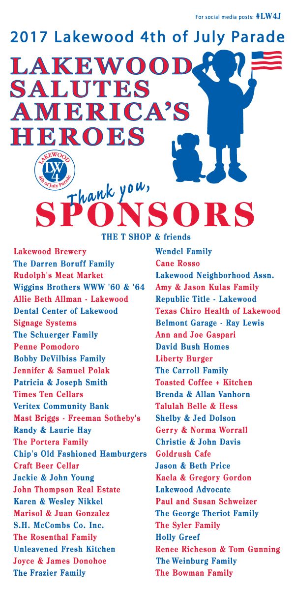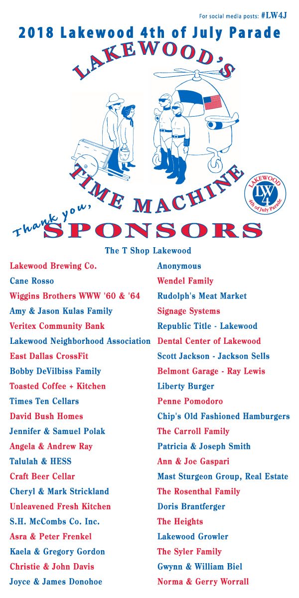 Although the Lakewood 4th of July Parade is non-commercial, we do encourage and acknowledge sponsorship from neighbors and neighborhood businesses alike. All Sponsors have their names proudly displayed on a Sponsor Board which participates in the parade and is displayed at the "Parade Grounds" afterwards. We duplicate that Sponsor Board here, for the current and prior years. Please EMail us at: |